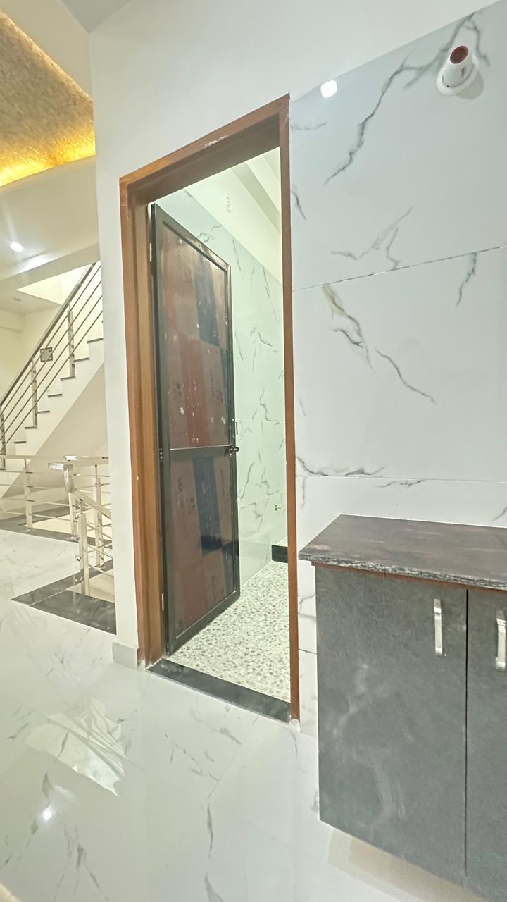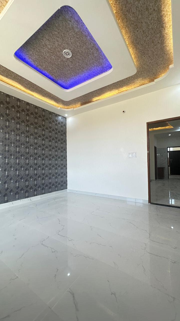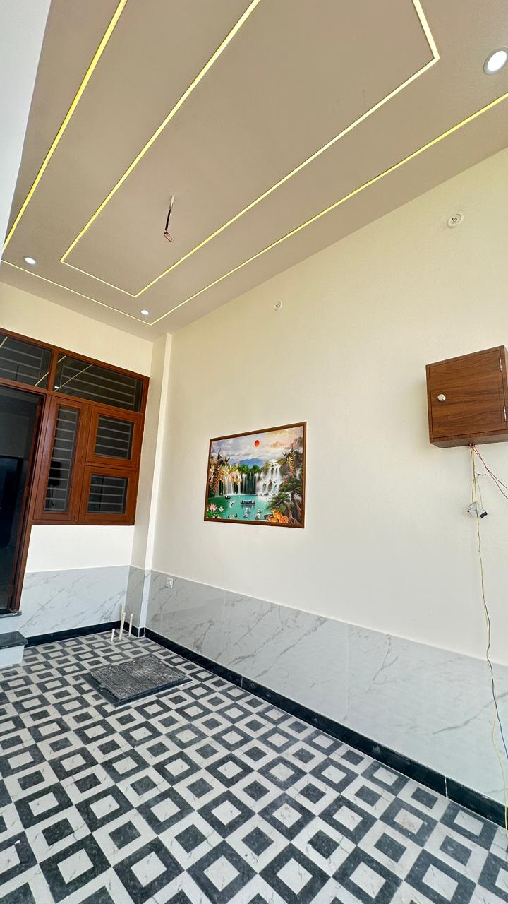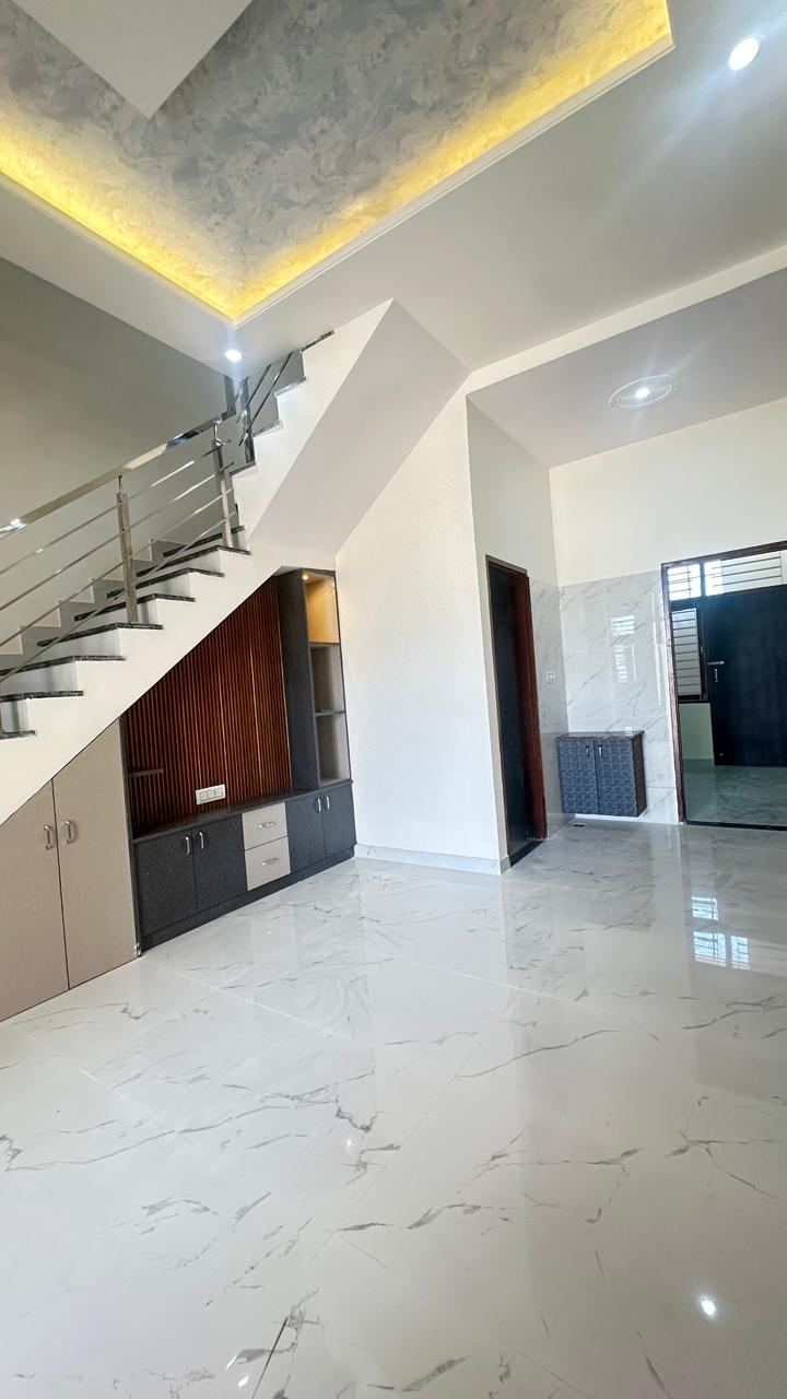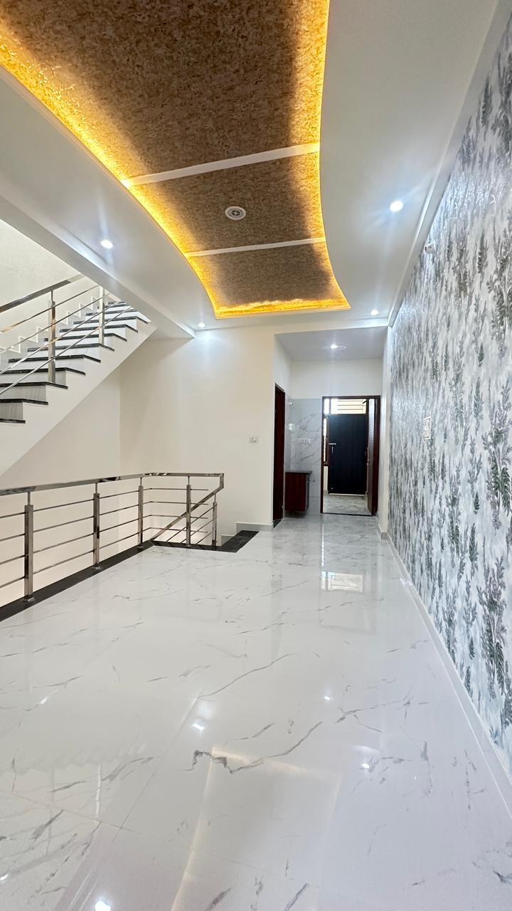 The house offers spacious rooms, excellent ventilation, and an elegant blend of white and dark stone textures. Recessed lighting under the balcony ceiling and designer wooden-finish paneling enhance the luxurious feel. Wide openings, modern gate designs, and high-quality construction make this home a perfect choice for families seeking comfort, style, and long-term value.